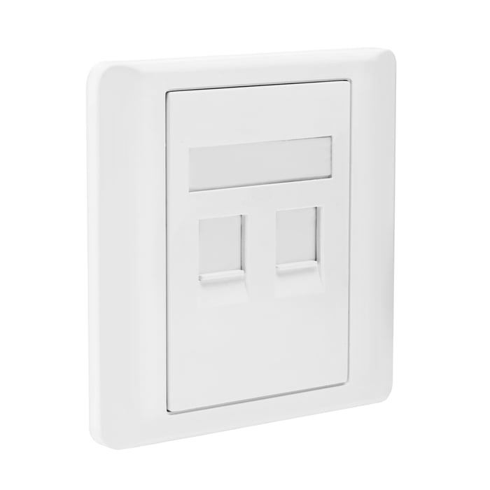 Dobbeltuttak for Keystone-moduler. Rett uttak. Passer i standard apparatboks eller med forhøyningskappe. Med beskyttelseslokk og merkelapp. Farge: RAL 9001 (hvit).