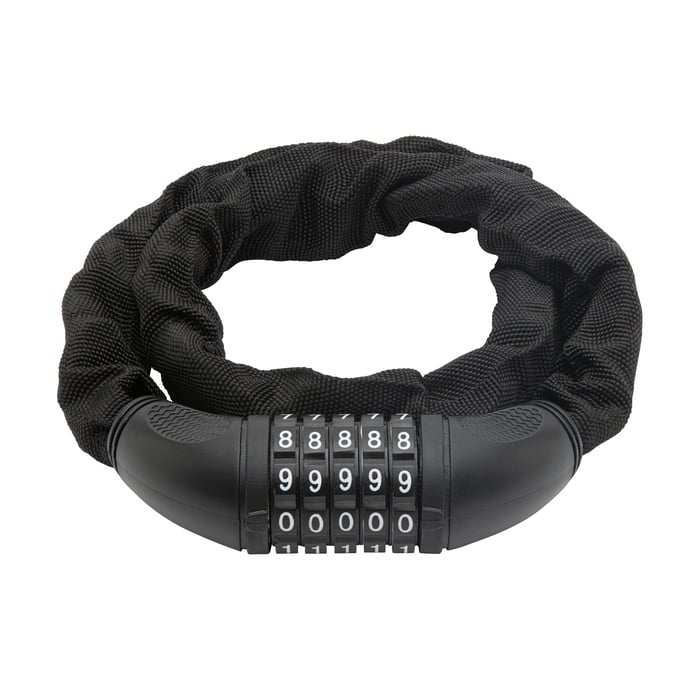 Kraftig kjettinglås med nylondeksel. Har femsifret kombinasjonslås (0–9). Koden kan endres. Tykkelse: 5,5 mm. Lengde: 90 cm. Vekt: 680 g.