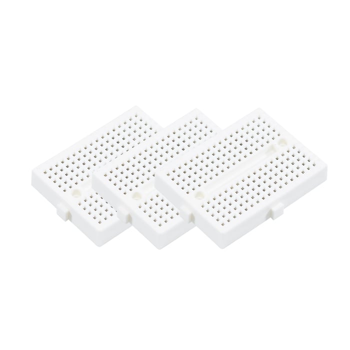 Sett med tre koblingsbrett med 170 tilkoblingspunkter. For raske og loddefrie tilkoblinger. Perfekt til utvikling og tilfeldige eksperimenter. Flere kort kan festes sammen slik at du får en større eksperimentoverflate. Hullavstand: 2,54 mm. Mål: 45x34 mm.