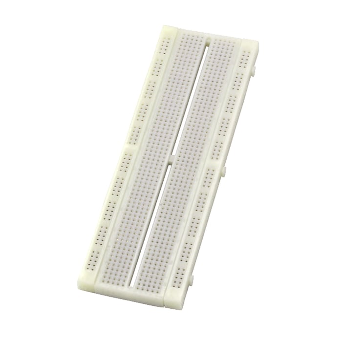Koblingsbrett med 830 tilkoblinger. For raske og loddefrie tilkoblinger. Perfekt til utvikling og tilfeldige eksperimenter. Flere brett kan hektes sammen for å få en større eksperimentoverflate. Hullavstand: 2,54 mm. Mål: 165x55 mm.