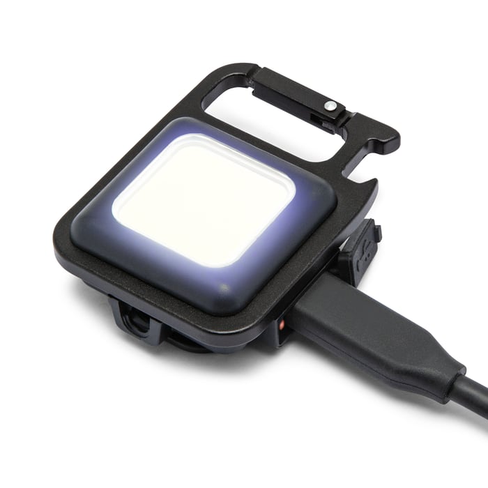 Lyssterk multifunksjonslykt med innebygd karabinkrok, magnet og flaskeåpner samt utfellbar løkke som fungerer som stativ. Bare 60x45x20 mm stor – passer enkelt i lommen, hanskerommet eller sekken. Flere lysmoduser og lysstyrker som fast eller blinkende lys. Det oppladbare og innebygde batteriet lades via medfølgende USB-C til USB-C-kabel (USB-lader selges separat). OBS! Fjern lampen forsiktig fra metalliske gjenstander da magnetens styrke kan føre til at den løsner fra enheten.