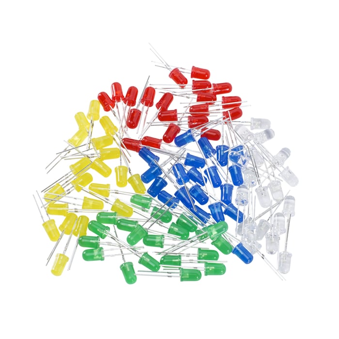 Pakke med 100 lysdioder i fem farger. 20 av hver type: rød, grønn, blå, gul og hvit (kaldhvit). Mål: Ø5 mm.