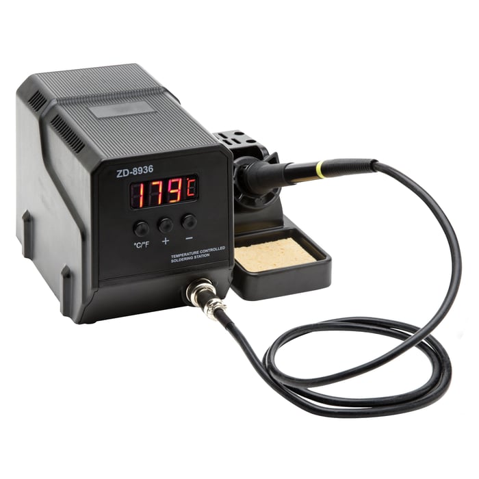 Profesjonell loddestasjon med digital temperaturinnstilling. LCD-displayet viser innstilt temperatur (regulerbar mellom 160 og 480 °C). Rask oppvarming (blir 300 °C på under 10 s). Loddebolten er liten og lett med et komfortabelt håndtak som ikke blir varmt. Egnet loddespiss: (40572) til (40576).