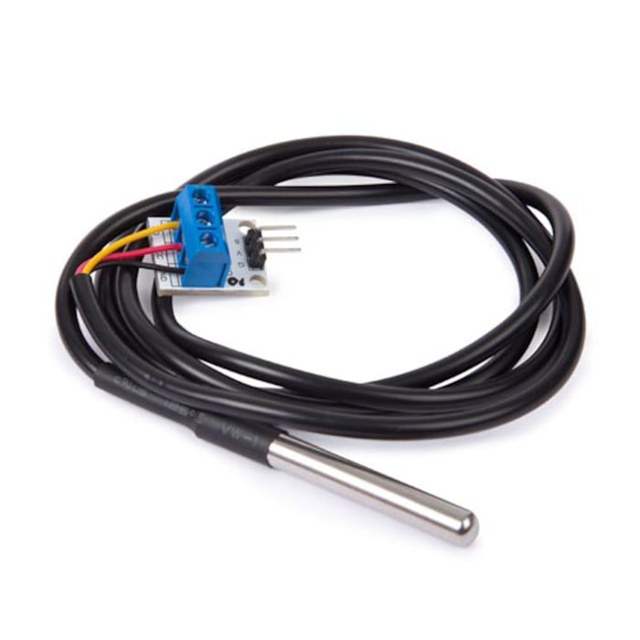 Vanntett temperatursensor (DS18B20) på kabel med adapter for Arduino. Klarer ekstrem kulde og varme (-55 til 125 °C). Nøyaktighet: ±0,5 °C ved -10° til 85 °C. Driftsspenning: 3-5,5 V. Lengde: 91 cm.