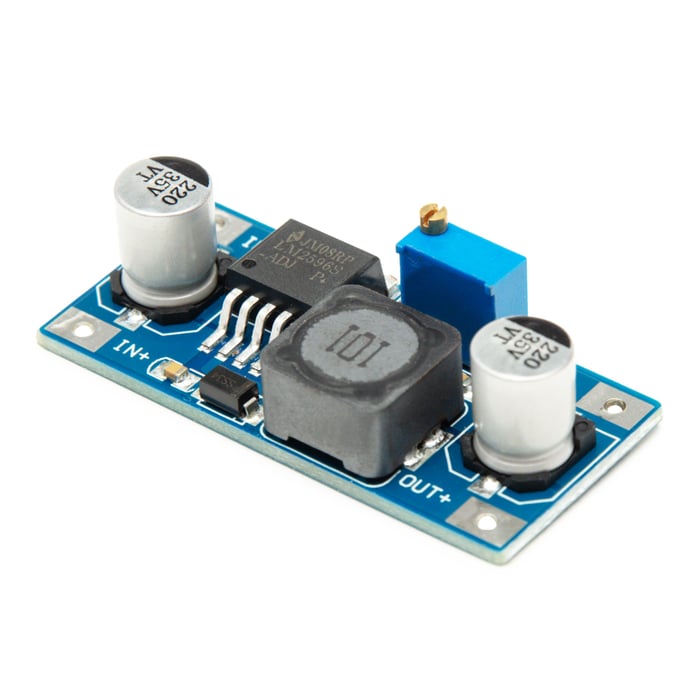 Switchet spenningsregulatormodul basert på LM2596S. Brukes for å senke spenningen til ulike prosjekter og komponenter. Omformer 3-40 V til 1,25-35 V. For likestrøm (DC). Maks. 2,5 A. Bruk kjøleribbe ved effekt på mer enn 10 W. Lav varmeutvikling takket være høy effektivitet (>90 %). Switch-frekvens: 150 kHz. Mål: 49x26x12 mm.