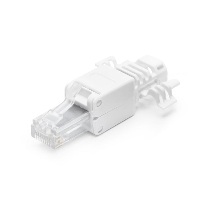 Modulkontakt RJ45 (8/8) for rund solid Cat. 6a UTP-kabel. Enkel verktøyfri montering. Lederne legges i de fargemarkerte sporene og klemmes fast når kontakten lukkes. Stabil konstruksjon og robust strekkavlastning.