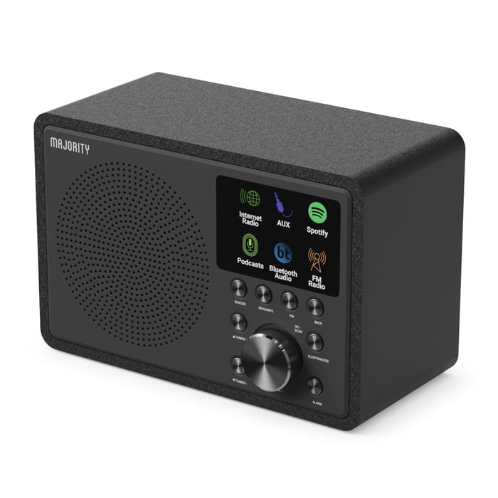 Majority Touro er en stasjonær radio som kombinerer sjarmerende retrodsign med dagens lydteknologi. Med støtte for både DAB/DAB+ og FM-radio får du tilgang til et bredt utvalg av kanaler med krytallklar lyd, og med Bluetooth kan du enkelt streame din favorittmusikk direkte fra mobilen. den elegante finsihen gjør at Touro passer perfekt i både klassiske og moderne miljøer, mens den klare skjermen og brukervennlige knapper gir enkel kontroll. En stilfull lydløsning for hjemmet - uten at du behøver batterier.