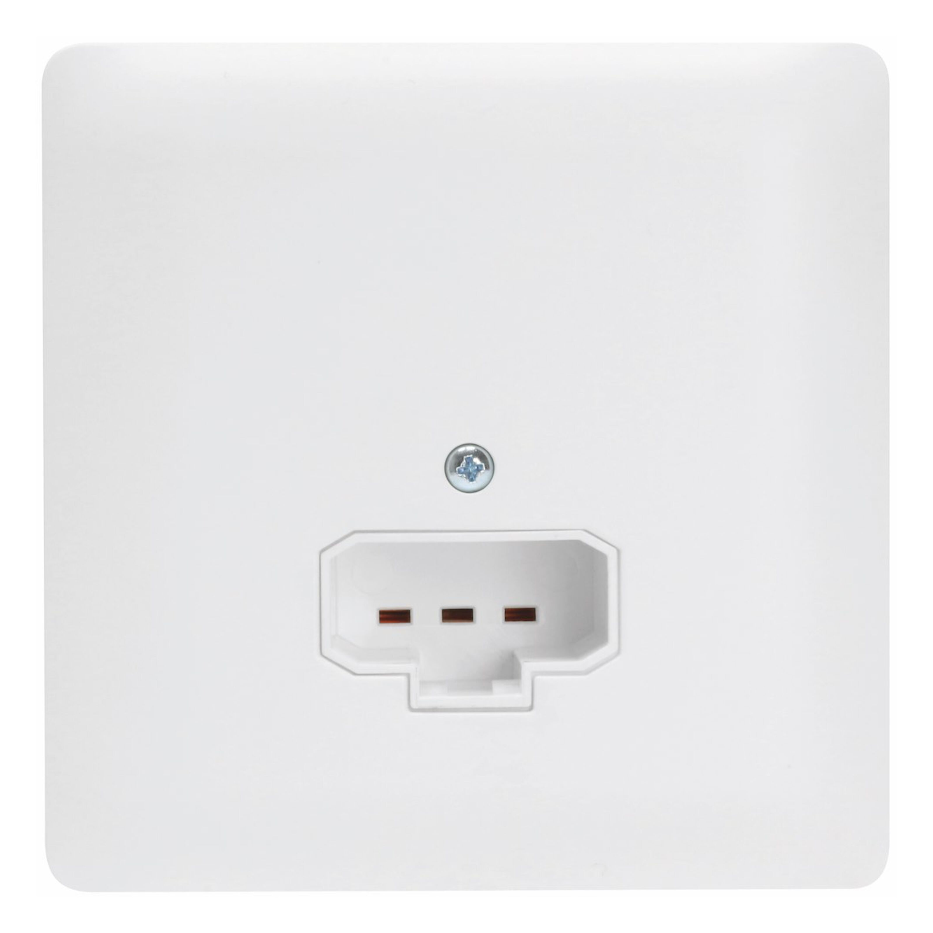 Innfelt jordet uttak for DCL-støpsel. Passer for apparatbokser, koblingsbokser og armaturbokser. Kan suppleres med forhøyningsramme for utenpåliggende montering. 250 V / 6 A. Kabelareal: 1,5 mm².