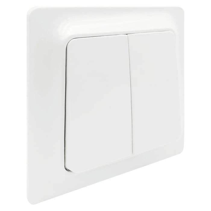 Innfelt strømbryter med skruetilkobling for installasjon i hjemmet. Leveres uten festeklør. Nominell strøm: 10 A, 250 V. Utførelse: Krone. Kapslingsklasse: IP20. Farge: Kremhvit RAL 9001.