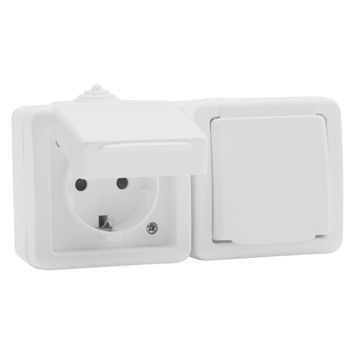 Kapslet vegguttak for installasjon i hjemmet. Tidløs design for utenpåliggende montering med skruetilkobling. Husdyrsikret og med gjennomgående innføringshull med strupenippel. Nominell strøm: 16 A, 250 V. Utførelse: 2-veis med jord. Mål: 142x80x55 mm. Kapslingsklasse: IP54.