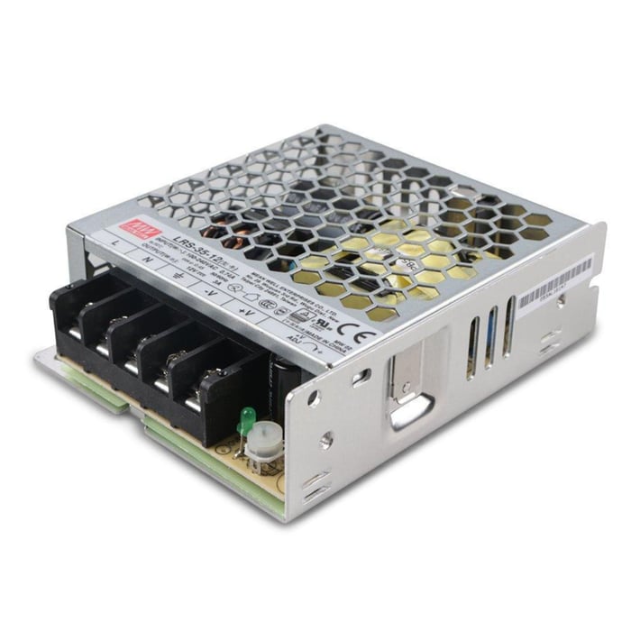 Switchet strømforsyning i metall med skruterminal for innebygging. Enkel utgang som leverer opptil 6 A. Beskyttet mot overbelastning, overspenning og kortslutning. Utspenning: 12 V (kan reguleres ±10 %). Innspenning: 88-264 V (AC). Vekt: 410 g. Mål: 99x97x30 mm.