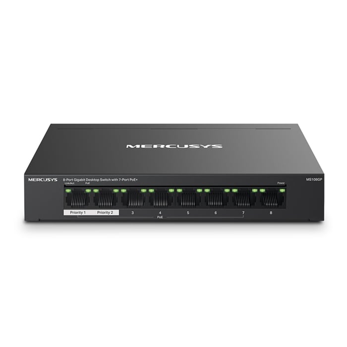 Bygg ut nettverket med Mercusys 8-porters gigabitswitch med PoE+-støtte på 7 av portene – en kraftig og fleksibel løsning for rask datatrafikk og enkel installasjon. Støtte for PoE+ (Power over Ethernet) gjør det mulig å strømforsyne og koble til kompatible enheter som IP-kameraer og aksesspunkter via én enkelt nettverkskabel. MS108GP har en rekkevidde på opptil 250 meter i Extend-modus og en total effekt på 65 watt. I tillegg er den stillegående og rask å komme i gang med.