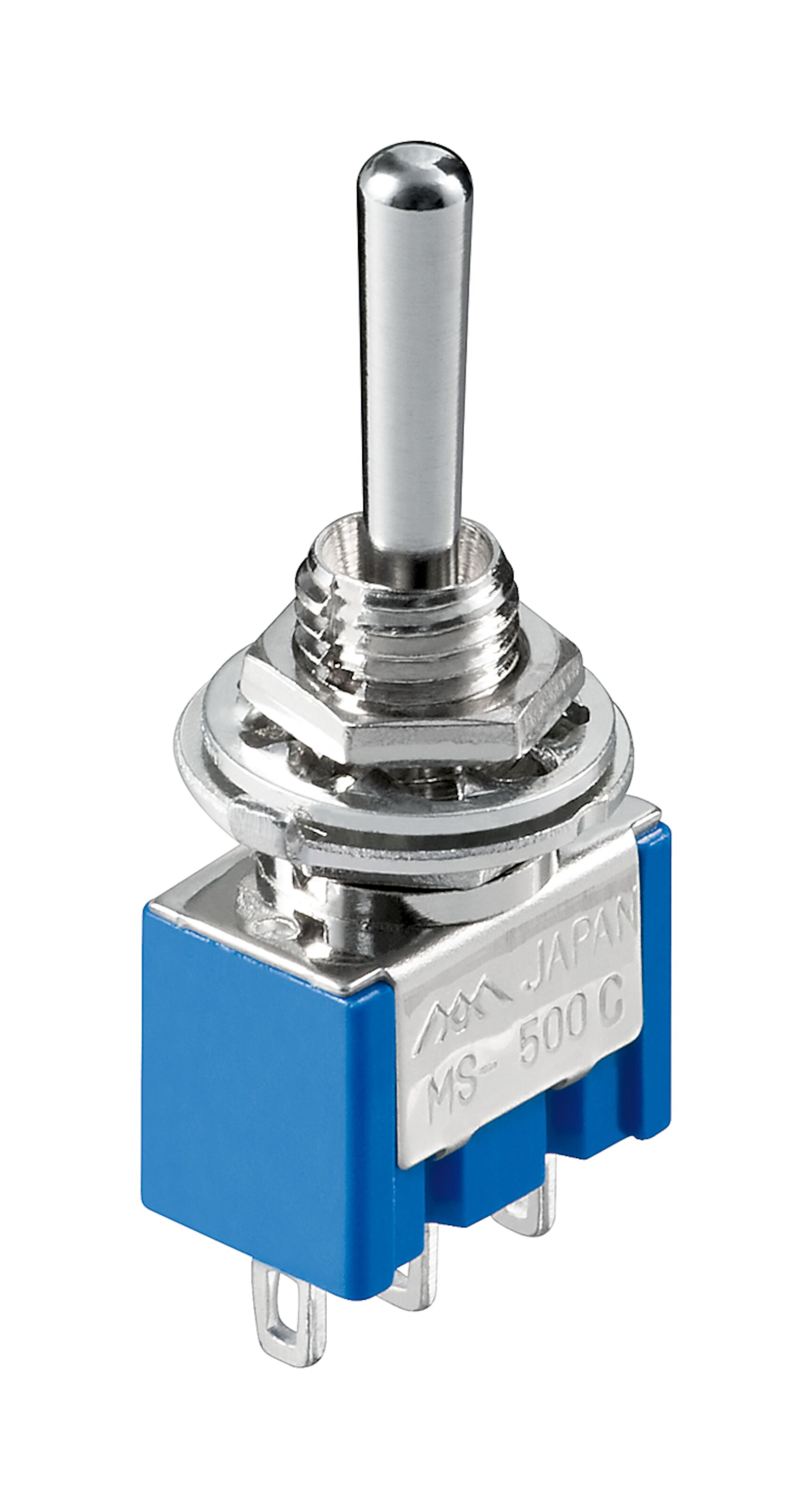 Liten vippebryter. Maks: 125 VAC eller 28 VDC / 5 A. Svingarm: 10 mm. Monteringshull: Ø6 mm. Loddetilkobling.