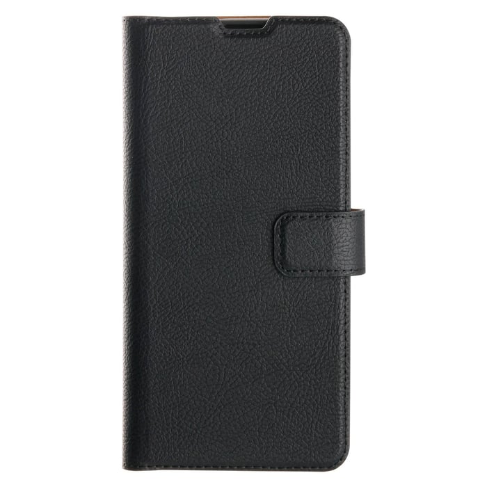 Mobiletui i slank utforming for Galaxy A02s. Stativfunksjon, tre lommer for kredittkort og en lomme for sedler. Har magnetlås og åpninger for kamera, knapper og samtlige porter.