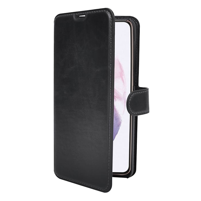 Mobiletui i slank utforming for Galaxy S21. Lommer for kredittkort og en lomme for sedler. Har magnetlås og åpninger for kamera, knapper og samtlige porter.