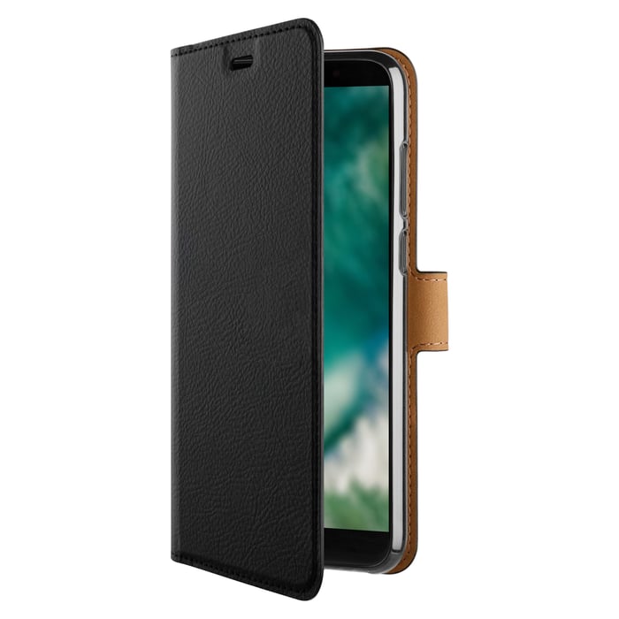 Mobiletui i slank utforming for Huawei Y6 2018. Stativfunksjon, to lommer for kredittkort og en lomme for sedler. Har magnetlås og åpninger for kamera, knapper og samtlige porter.