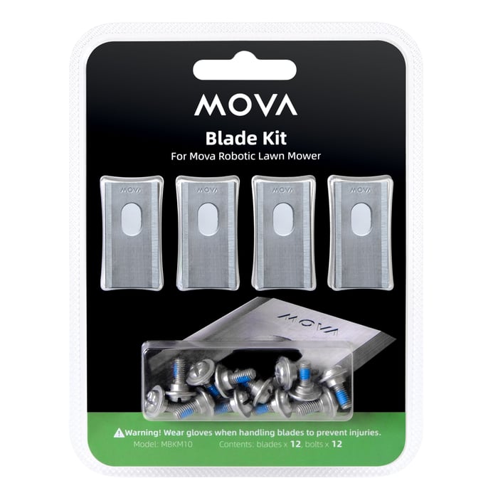 Sett med reservekniver for Mova 600 og 1000. Inneholder 12 kniver og 12 fester som gjør det enkelt å bytte ut slitte kniver på din robotgressklipper. Nye kniver gir kvass og jevn klipp og skåner gresset. De forlenger også gressklipperens levetid, ettersom motoren ikke må jobbe like hardt som med sløve kniver. Det er anbefalt å bytte kniver etter hver hundrede arbeidstime eller omtrent hver 6-8 uke, avhengig av gressforholdene.
