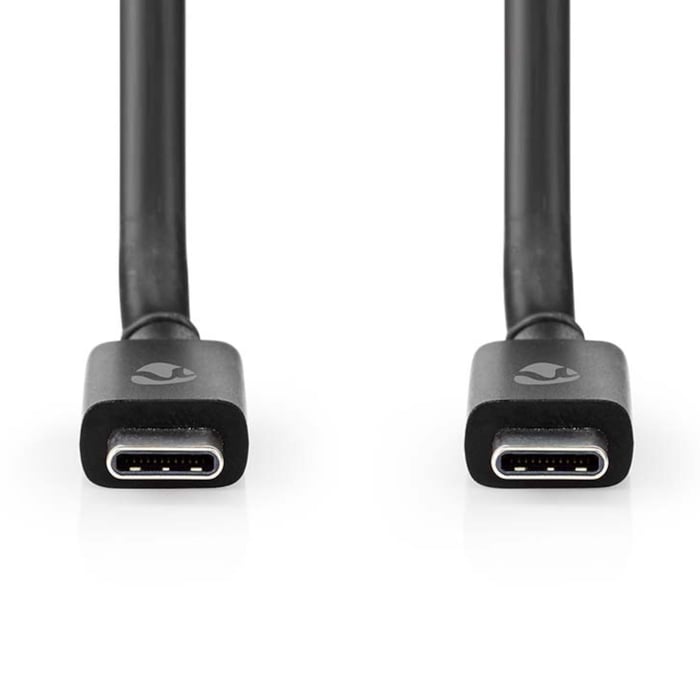 USB-C-kabel med støtte for dataoverføring, lading og bildesignal. Klarer hastigheter på opptil 40 Gb/s, lading opptil 240 W og bildesignal opptil 8K/60 Hz. Støtte for Displayport 1.4a, Displayport 2.0 og PCI Express-data, samt Thunderbolt 3. Lengde: 1 m.