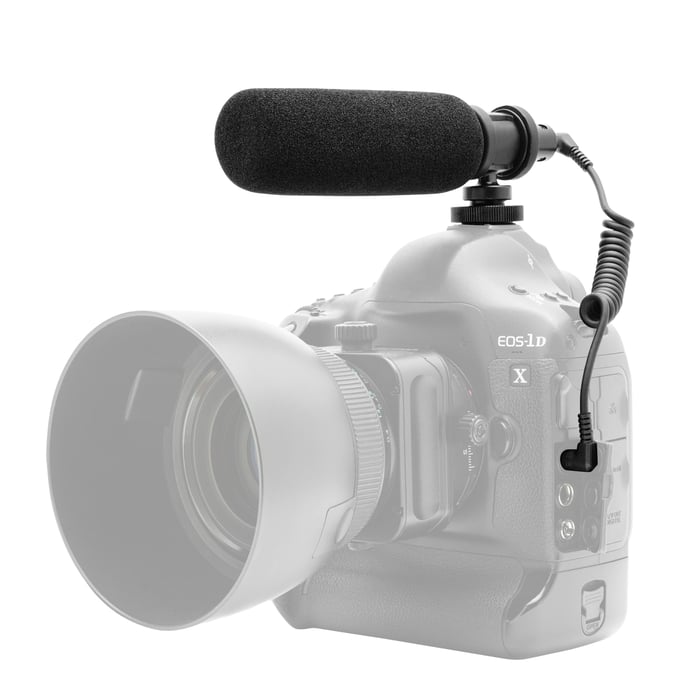 Retningsbestemt mikrofon (superkardoide) som gir betydelig bedre lydkvalitet enn kameraets innebygde mikrofon. Vindhette for bedre innspillingskvalitet utendørs. Feste for blitssko og stativgjenge på 1/4". Inkluderer adapter (TRRS) for tilkobling direkte til mobil, nettbrett eller annen innspillingsenhet.