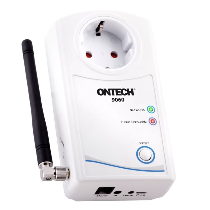 Ontech 9060 er en fjernstrømbryter som kommuniserer via mobilnettet (4G). Egnet for eksempelvis ovner som kobles til via stikkontakten. Utstyrt med to alarminnganger for funksjoner som temperatur- og strømbruddalarm. For innendørsbruk. Konfigureres og styres enkelt via Ontech Control i en webleser på mobil, datamaskin eller nettbrett (SIM-kort er inkludert). Kan også styres med SMS.