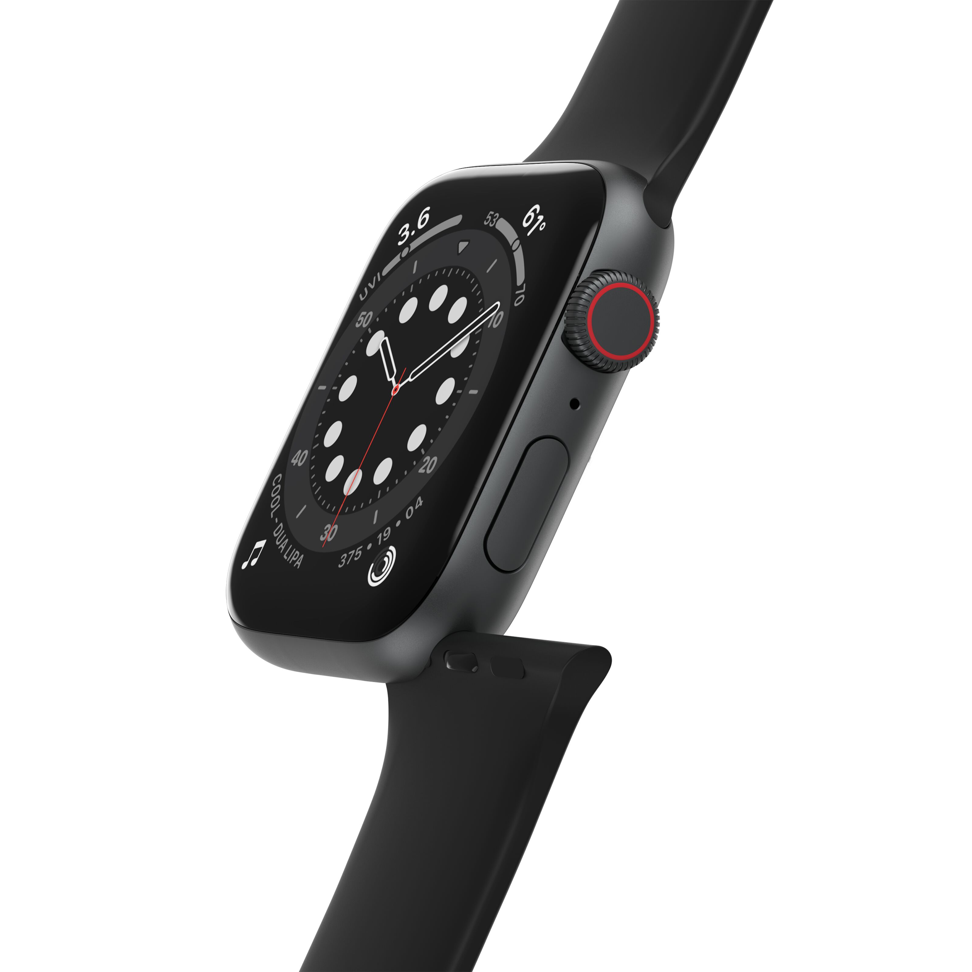 Elegant armbånd for Apple Watch laget av svettebestandig og komfortabelt silikon. Antimikrobielt materiale som slipper inn luft. Det gir en komfortabel følelse under trening og hverdagssysler. Praktisk standardlås som gjør armbåndet lett å tilpasse etter behov og situasjon. Passer Apple Watch 45/44/42 mm.