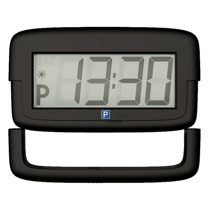 Digital P-skive som holder tiden selv. Et akselerometer registrerer bilens bevegelser og stiller seg inn på nærmeste hele eller halve time etter 20 sekunders parkering. Parkeringstiden kan også stilles inn manuelt, og du kan justere tiden opptil 30 minutter fremover fra den automatisk registrerte tiden. Veksler mellom sommer- og vintertid og tåler norsk klima (-35 til +75 grader). Festes enkelt ved hjelp av holderen, som monteres med dobbeltsidig teip. Drives av 1x CR2032-batteri (følger med). Batteritid: opptil 2 år. Mål: 80x45x10 mm. Kan konfigureres for parkeringsregler i ulike land.