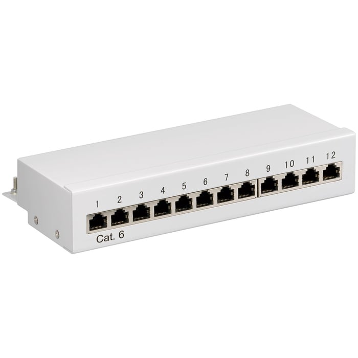 Patchboks laget av metall. Kategori 6 skjermet installasjon. Kan også brukes til uskjermet. Egnet verktøy: 40-272. Kan monteres direkte på vegg.