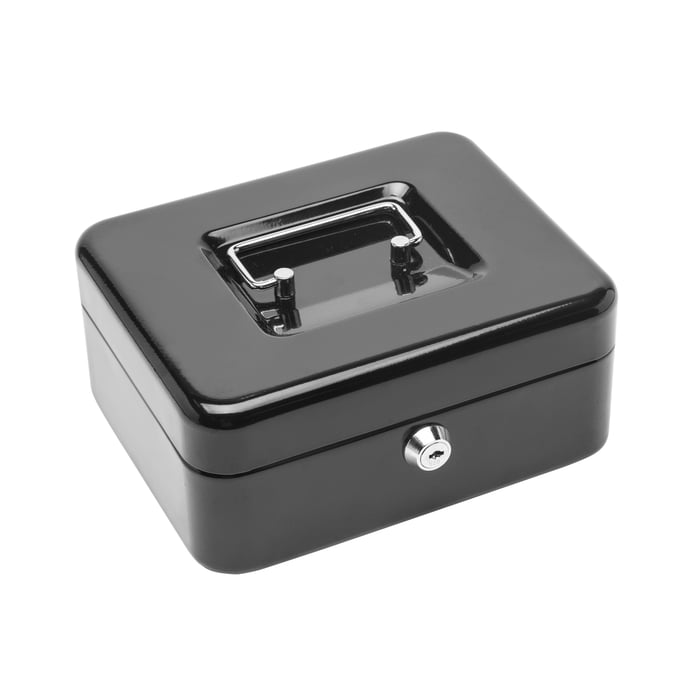 Metallboks med lås som fungerer utmerket som pengeskrin. Boksen har en uttakbar skuff med fem seksjoner for f.eks. mynter. Leveres med to små nøkler. Mål: 200x90x160 mm.