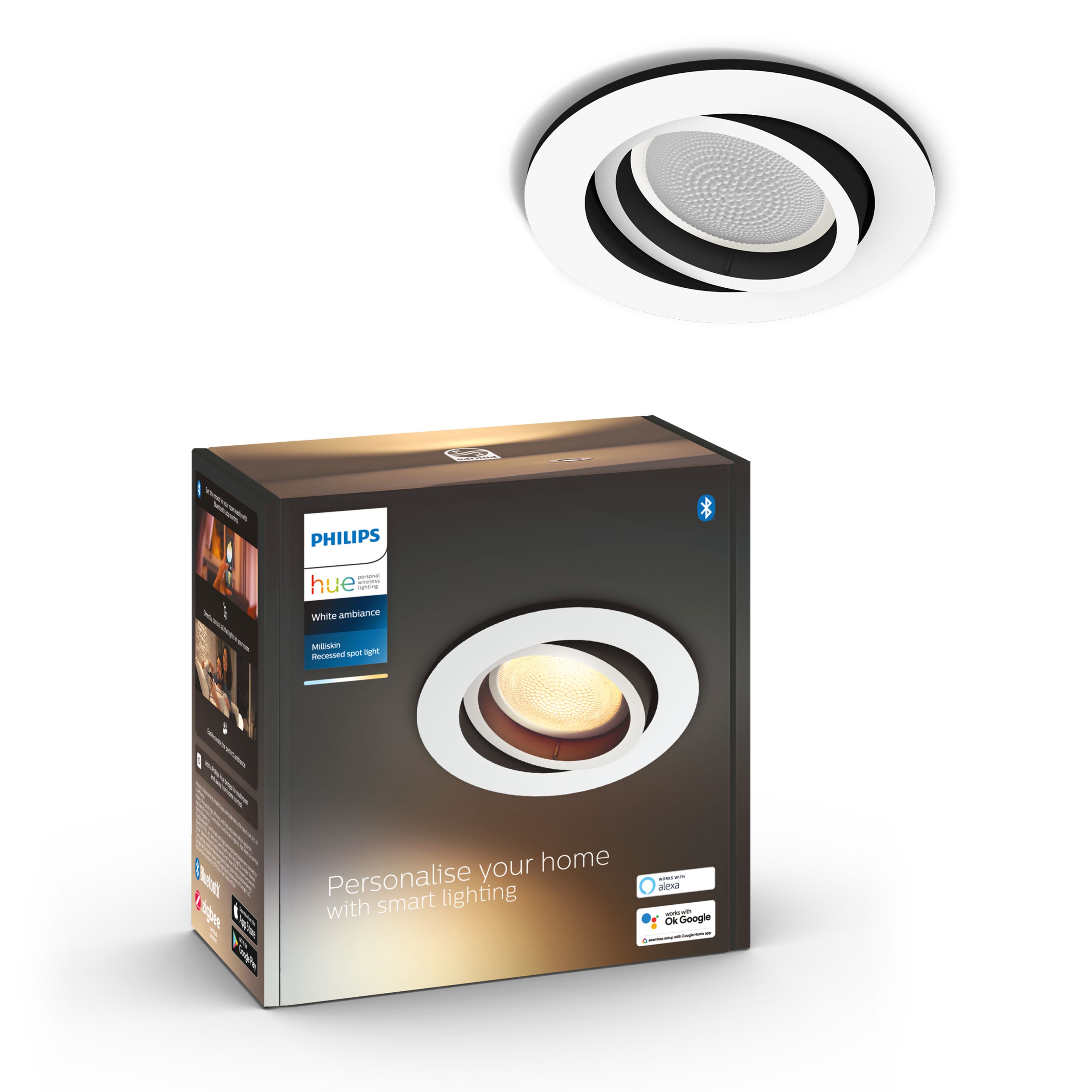 Philips Hue Milliskin er en avrundet, elegant innfelt spotlight med justerbart hode for fokusert belysning med en medfølgende White and Ambiance GU10 spotlight. En spotlight av høyeste kvalitet som er konstruert for å vare lenge og gi godt, detaljert lys. Armaturen kan lett kobles til Hue-økosystemet og kan deretter styres enten med en smartenhet eller et av Hue-tilbehørene. Slapp av med et varmhvitt lys eller få energi fra kaldt hvitt lys. Sett farge på hverdagen med Philips Hue