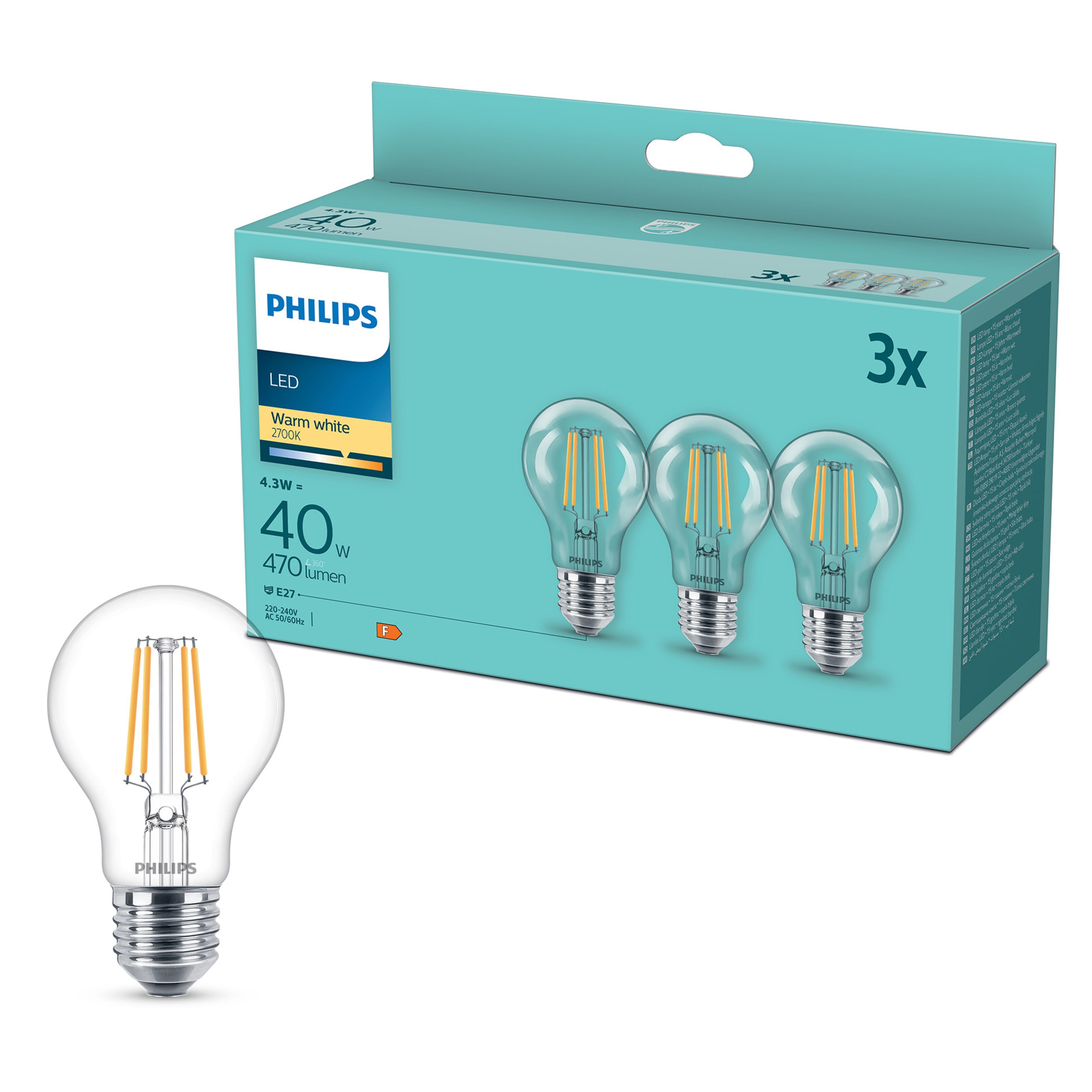 Varmhvit LED-pære med E27-sokkel. Effekt: 4,3 W (tilsvarer 40 W glødelys). Lysfluks: 470 lm. Levetid: opptil 15 000 t. Fargetemperatur: 2700 K. Spredningsvinkel: 300°. CRI: 80. Kan ikke dimmes. Spenning: 230 V. 3-pk.