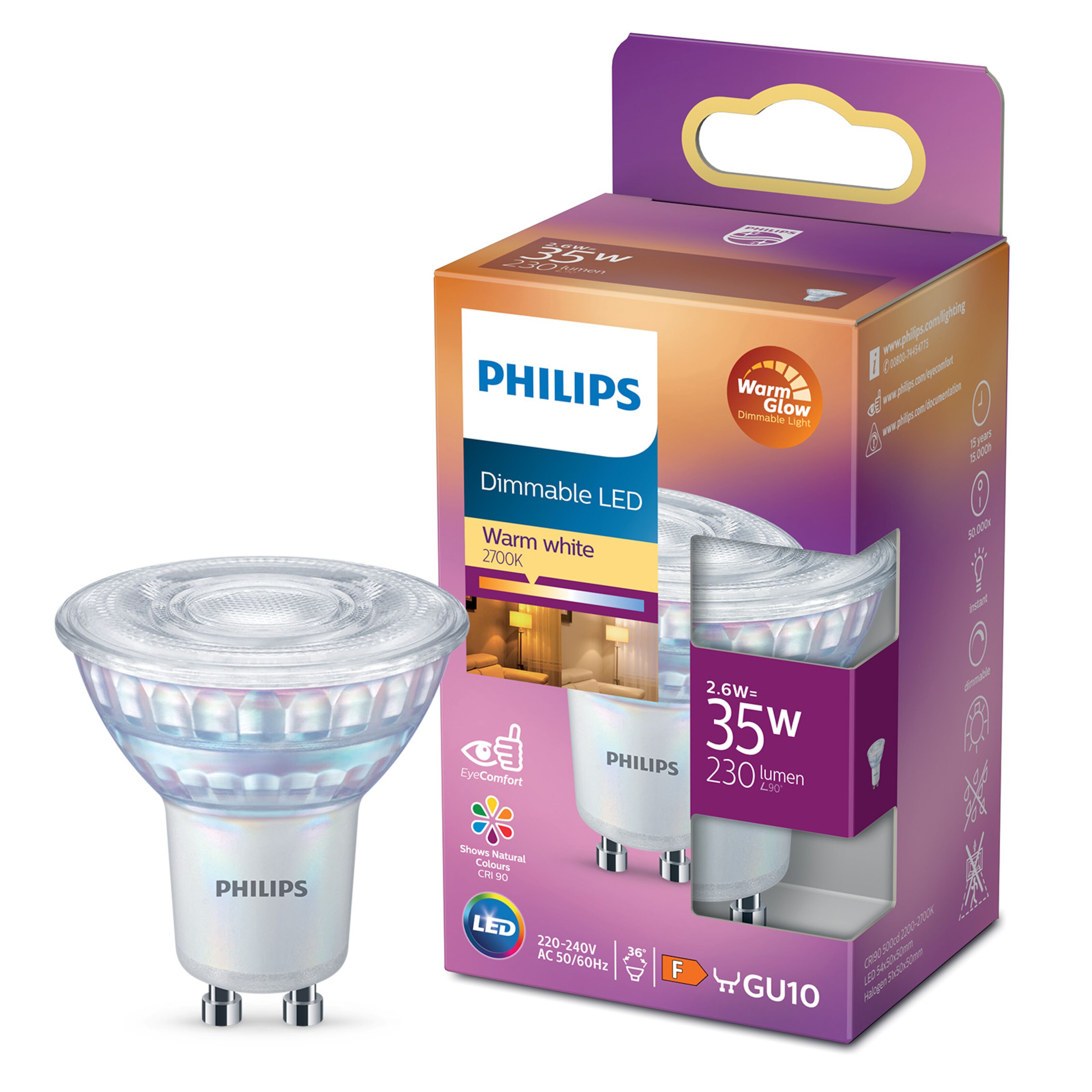 Varmhvit og dimbar LED-pære med GU10-sokkel. Effekt: 2,6 W (tilsvarer glødepære på ca. 35 W). Lysfluks: 230 lm. Levetid: opptil 15 000 t. Fargetemperatur: 2200-2700 K. Spredningsvinkel: 36°. CRI: 80. Spenning: 230 V. Mål: Ø50x54 mm.