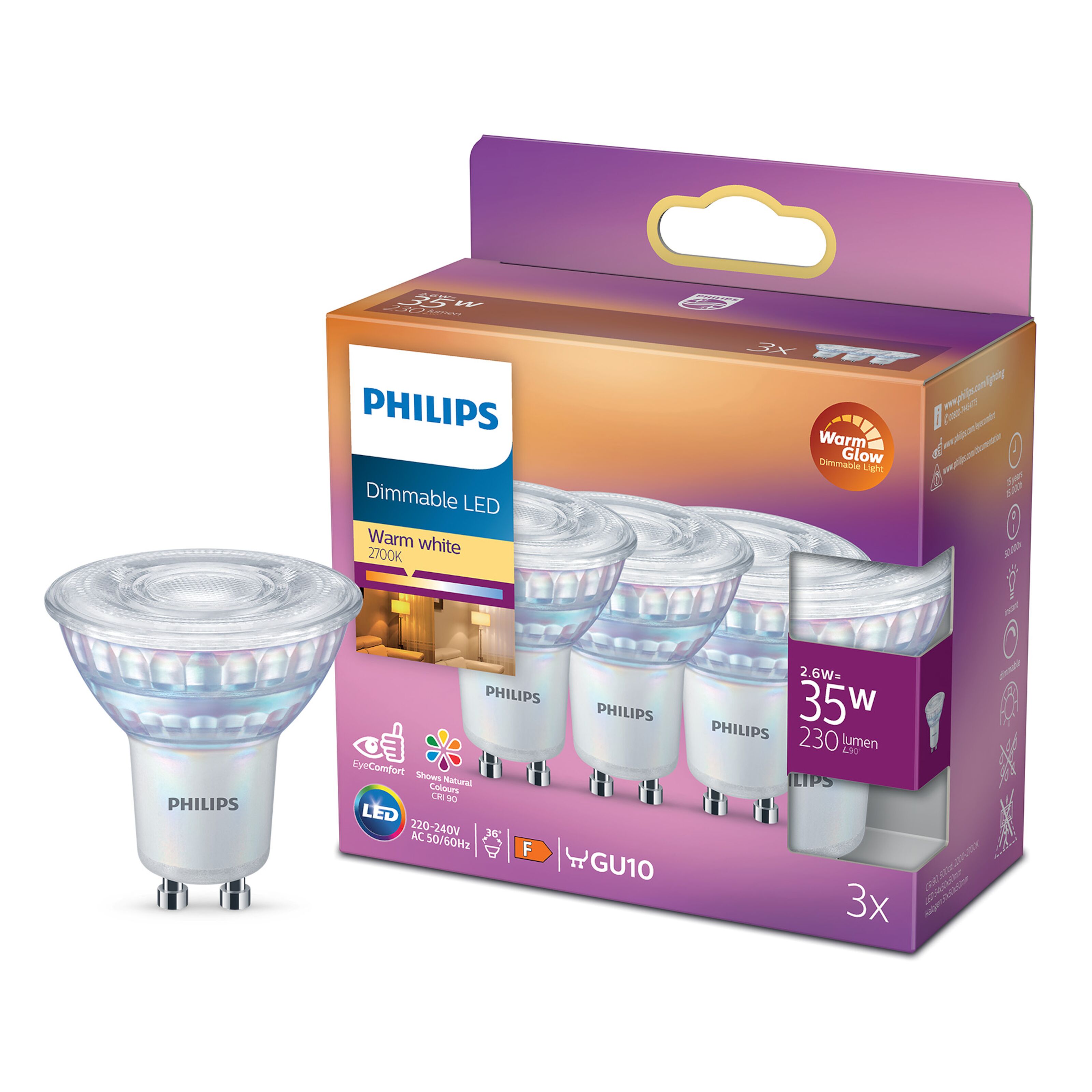 Dimbar varmhvit LED-pære med GU10-sokkel. Effekt: 2,6 W (tilsvarer 35 W glødelys). Lysfluks: 230 lm. Levetid: opptil 15 000 t. Fargetemperatur: 2200-2700 K. CRI: 90. Spredningsvinkel: 36°. Spenning: 230 V. 3-pk.