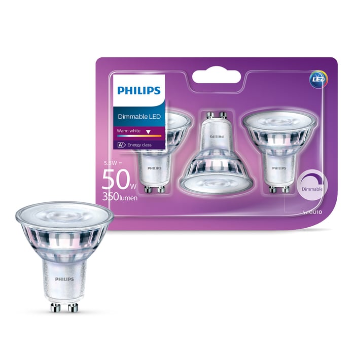 Varmhvit og dimbar LED-pære for GU10-sokkel. Effekt: 3,8 W (tilsvarer glødelys på ca. 50 W). Lysfluks: 345 lm. Levetid: opptil 15 000 t. Fargetemperatur: 2200-2700 K. Spredningsvinkel: 36°. CRI: 90. Spenning: 230 V. Mål: Ø50x54 mm. 3-pk.