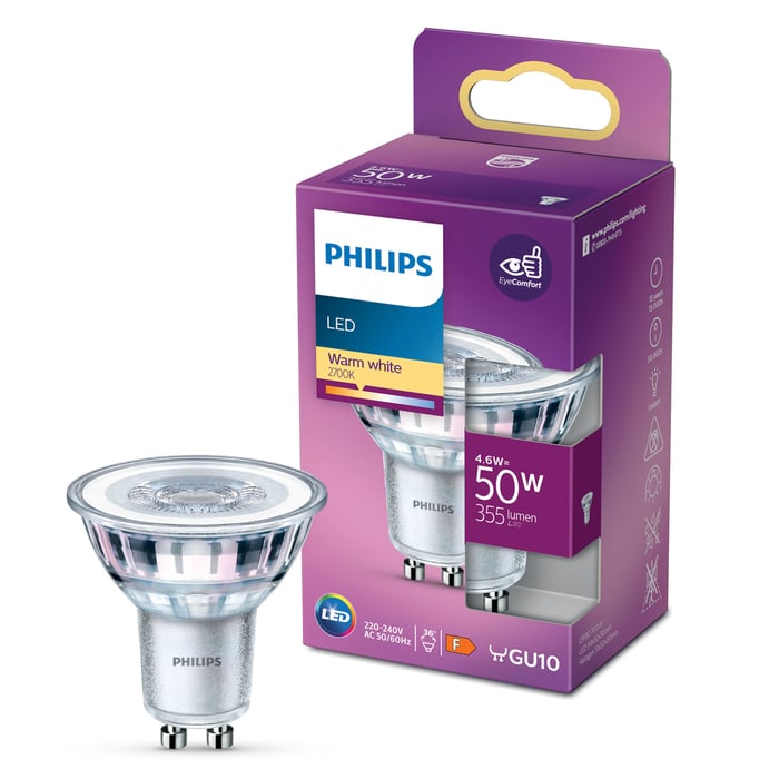 Varmhvit LED-pære med GU10-sokkel. Effekt: 4,6 W (tilsvarer glødepære på ca. 50 W). Lysfluks: 355 lm. Levetid: opptil 15 000 t. Fargetemperatur: 2700 K. Spredningsvinkel: 36°. CRI: 80. Spenning: 230 V. Kan ikke dimmes. Mål: Ø50x53 mm.