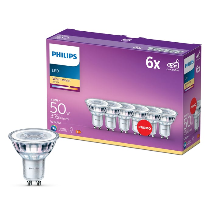 Varmhvit LED-pære for GU10-sokkel. Effekt: 4,6 W (tilsvarer glødelys på ca. 50 W). Lysfluks: 355 lm. Levetid: opptil 15 000 t. Fargetemperatur: 2700 K. Spredningsvinkel: 36°. CRI: 80. Spenning: 230 V. Kan ikke dimmes. Mål: Ø50x53 mm. 6-pk.