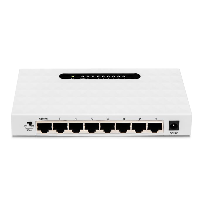 8-porters gigabit-Ethernet-switch for hjem og små bedrifter. Enkel installasjon, stabil ytelse og høy kapasitet – perfekt for å opprette eller utvide et nettverk. Switchens porter tilpasser tilkoblingsmodusen automatisk og støtter både auto-MDI/MDIX og VLAN-konfigurasjon. Automatisk håndtering av MAC-adresser. Kan monteres på veggen.