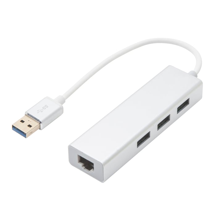 USB 5 Gb/s (USB 3.0)-hub i aluminium med tre porter (USB-A) og gigabit-nettverkskort. Hastighet: opptil 5 Gb/s på USB-portene og 1 Gb/s på nettverksporten. Drives direkte fra datamaskinens USB-port. Kompatibel med Windows og Mac OS.