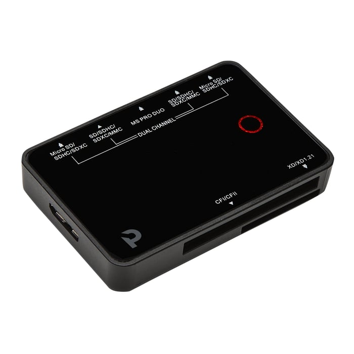 Rask minnekortleser som overfører innhold til datamaskinen fra minnekort via USB 5 Gb/s (USB 3.0). Leser SD-kort (SDHC og SDXC), Compact Flash (type 1 og 2), Micro-SD (SDHC og SDXC), XD-kort og MS Pro Duo. Har doble spor for SD- og Micro-SD-kort. Dual-channel gjør det enklere å kopiere mellom to like minnekort (begge vises samtidig på datamaskinen). Leveres med Micro-USB 5 Gb/s (USB 3.0)-kabel. Kompatibel med Windows Vista, 7, 8 og 10 samt Mac OS 10.6 eller nyere. Mål: 72 x 13 x 48 mm.