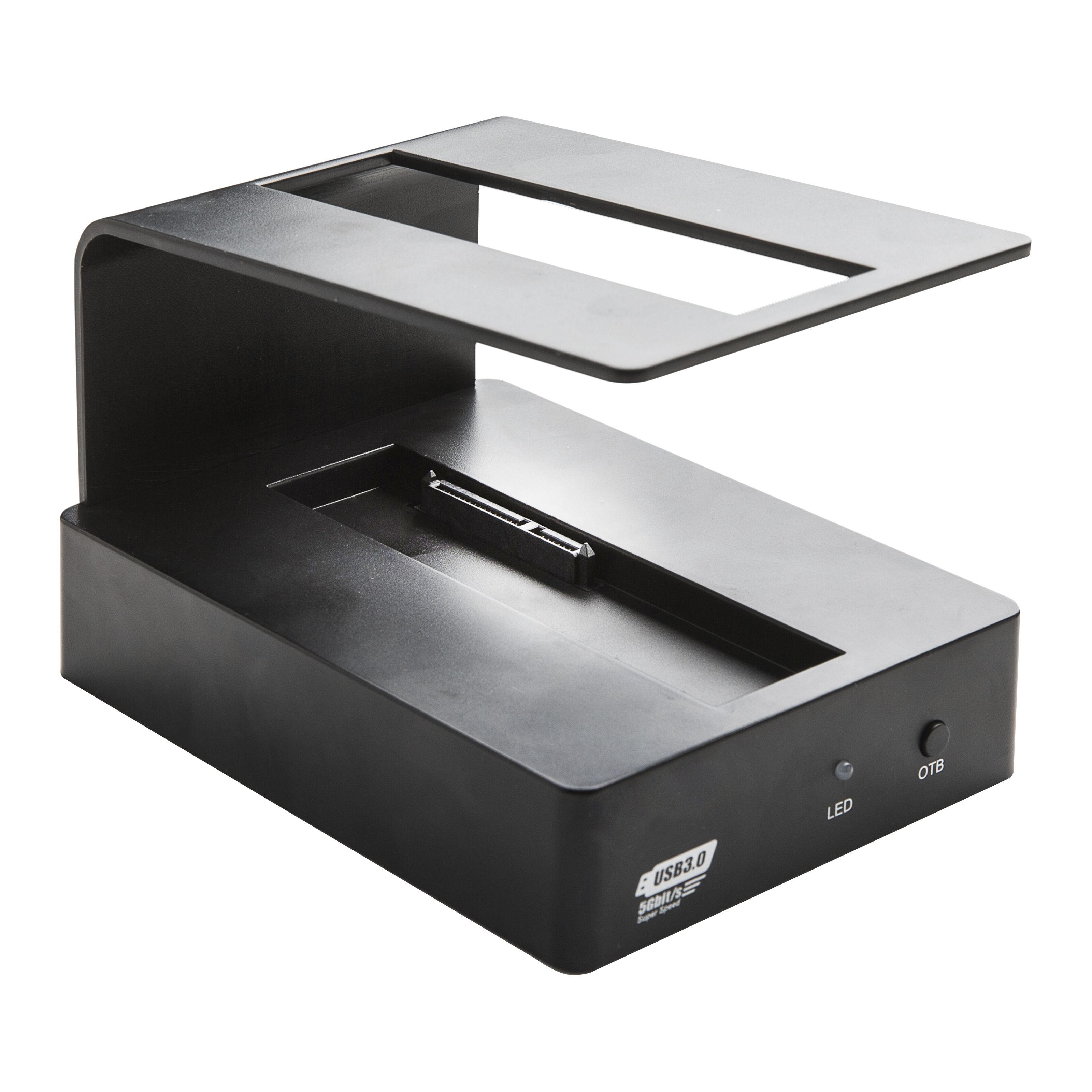 Dokkingstasjon for 2,5 eller 3,5-tommers harddisker (Sata 3 Gb/s). Kobles til med USB 5 Gb/s (USB 3.0) for høy overføringshastighet (bakoverkompatibel med USB 2.0). Støtte for disker større enn 2,2 TB. Har en praktisk OTB-knapp (One touch backup) som sikkerhetskopierer datamaskinen med et knappetrykk. Leveres med tilkoblingskabel (USB-B 3.0) og strømadapter. Mål: 127x114x84 mm.