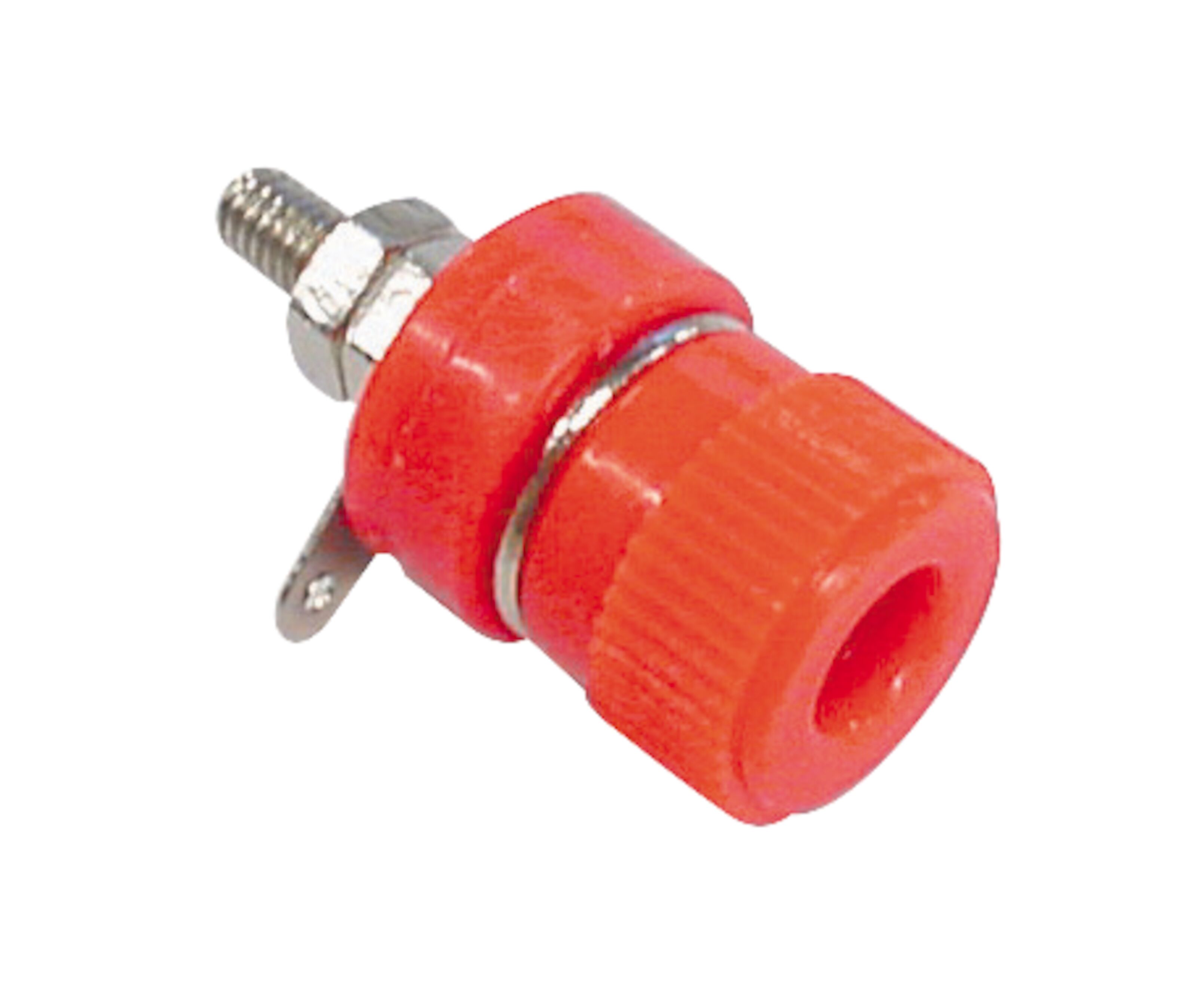 Isolert polskrue for 4 mm labplugg eller gaffelkabelsko. Panelhull: Ø 4 mm. Paneltykkelse = 12 mm. Total lengde: 32 mm. Maks 60 V 30 A.