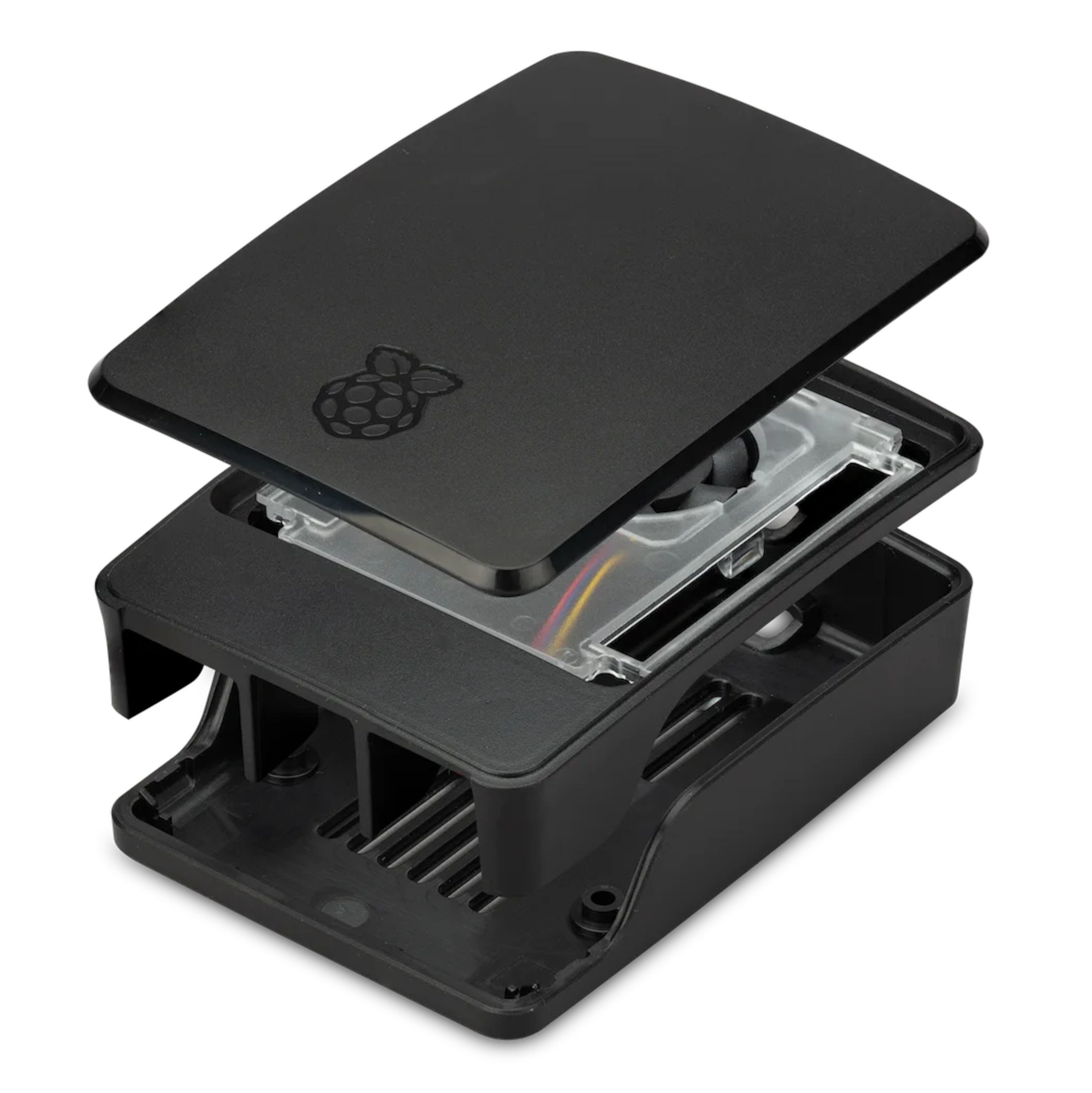 Offisielt Raspberry Pi-kabinett laget av hardplast (ABS) for Raspberry Pi 5 Model B. Verktøyfri montering med praktisk clip-on-design. Integrert vifte med støtte for ulike RPM – kobles direkte til Pi. Kjøleribber er inkludert.