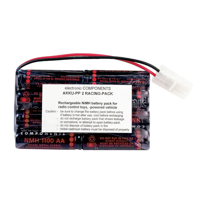 Hurtigoppladbar NiMH-batteripakke med Tamiya-kontakt og 1,5 mm²-silikonkabel. Består av 8 x AA-celler. Spenning: 9,6 V. Kapasitet: 2000 mAh. Vekt: 230 g. Mål: 103x57x15 mm.