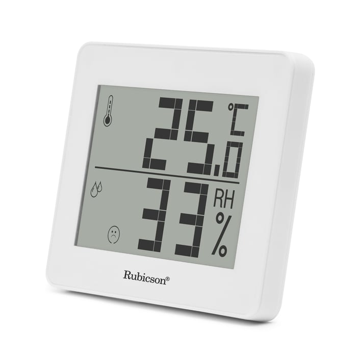 Hygrometer med tydelige sifre og innebygd termometer for innendørsbruk. Displayet har også en indikator for å vise optimal temperatur og luftfuktighet. Minnefunksjon for minimums-/maksimumstemperatur. Måleområde: 20 til 95 % RH, -10 til 50 °C (±1 °C). Drives av 1x CR2025-batteri (følger med). Mål: 99x81x12 mm.
