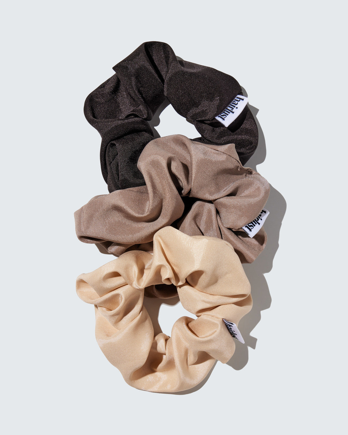 Silkemyke satin scrunchies laget av 100 % resirkulert polyester. Få en elegant følelse i hverdagen med Satin Silk Scrunchies, Medium, tilgjengelig i en 3-pakning. Våre scrunchies finnes i en rekke rike kaffe- og beigetoner, og selv med sitt silkemyke stoff sitter strikken sikkert i håret uten å skade det.