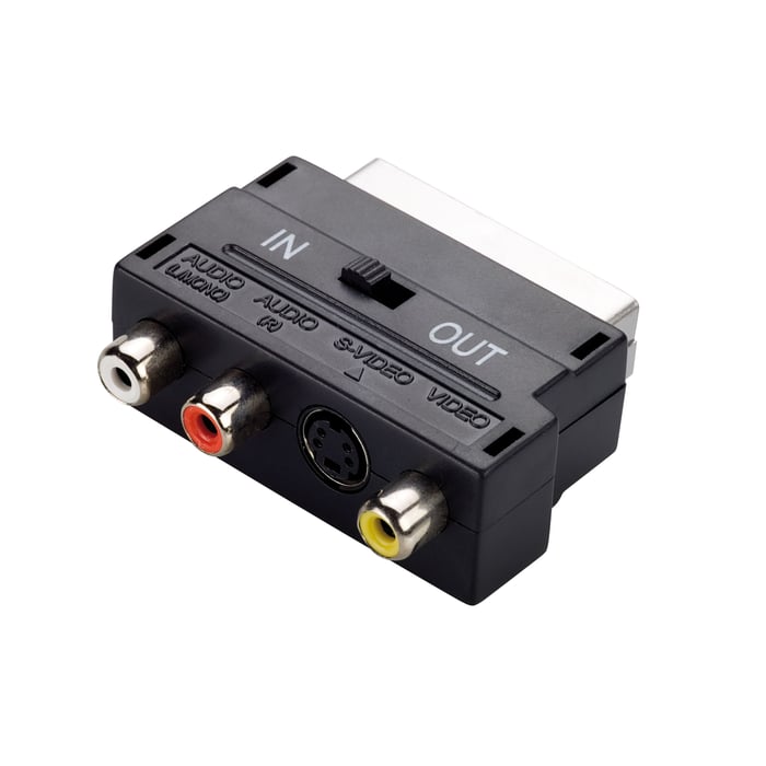 Velg signalretning med bryteren. Kontakter: 1 stk SCART (inn/ut-retning) 1 stk S-VHS (mini-DIN) 1 stk RCA-video (gul) 2 stk RCA-lyd (rød+hvit).