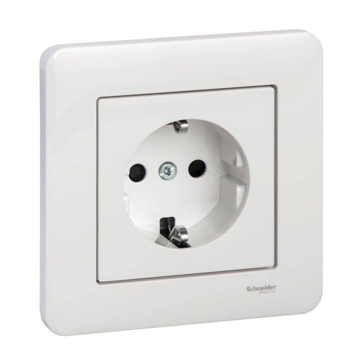 Innfelt jordet 1-veis vegguttak med skrueterminal fra Exxact-serien. Maks. strøm: 16 A. Kapslingsklasse: IP20. Farge: hvit (RAL 9003). Innbyggingsdybde: 28 mm. Mål: 87x87x39,8 mm.
