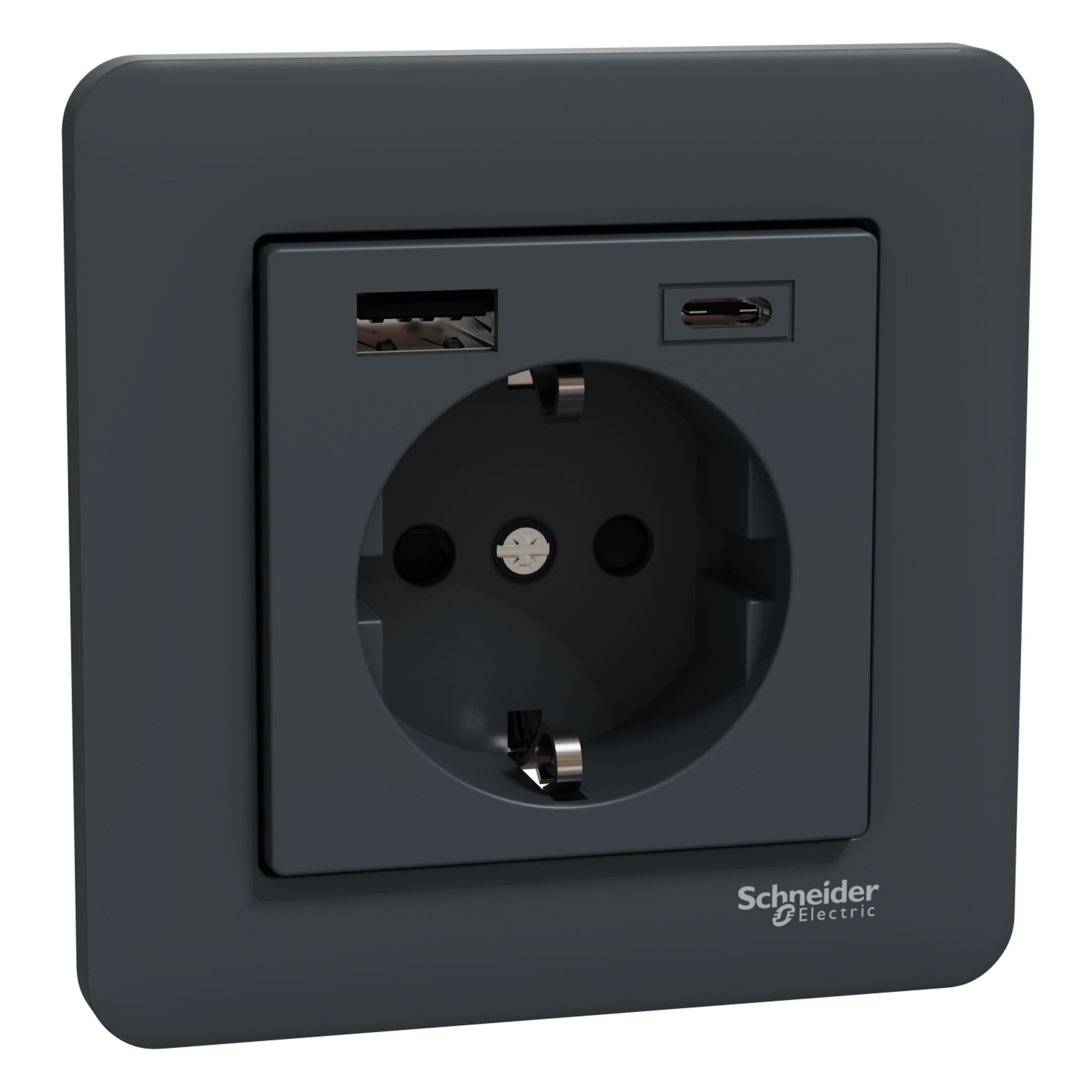 Jordet stikkontakt med innfelt design med ramme for installasjon i hjemmet. Integrerte USB-porter (1x USB-A, 1x USB-C). Nominell strøm: 16 A, 250 V. USB-A: 5 V/2,4 A. USB-C: 5 V/3 A.