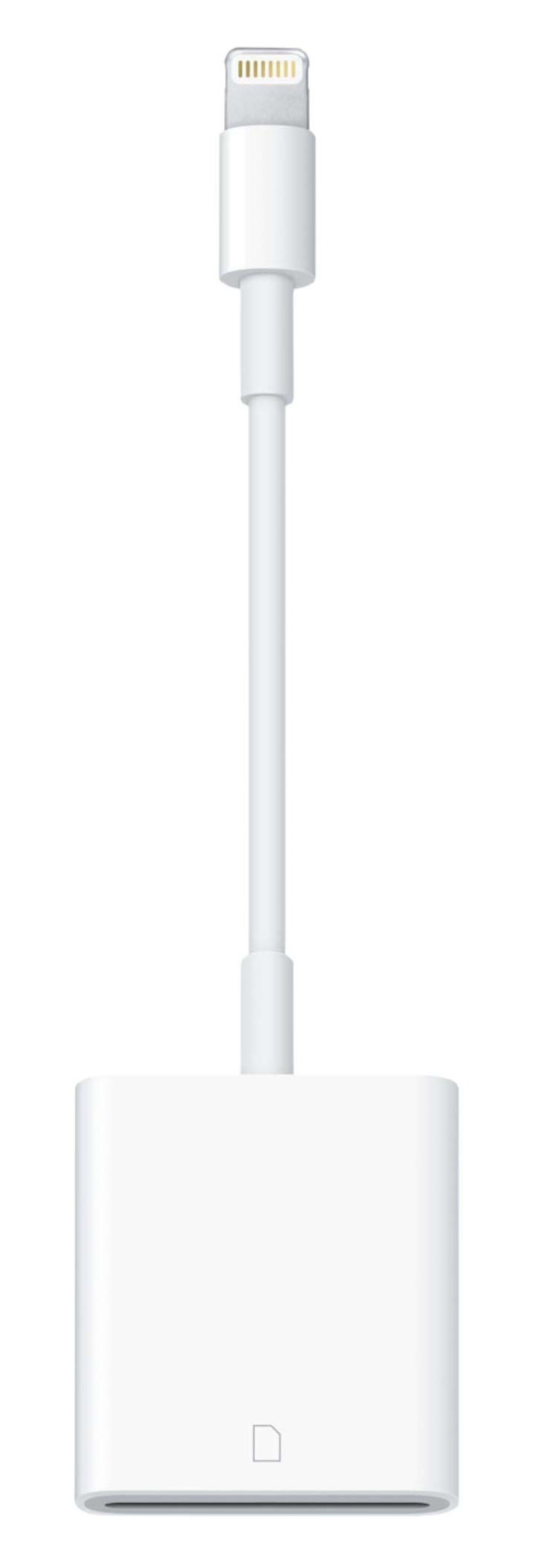 Adapter for å importere bilder og video fra et SD-kort til en iPad med Lightning-kontakt. Adapteren åpner automatisk fotoappen når den tilkobles.