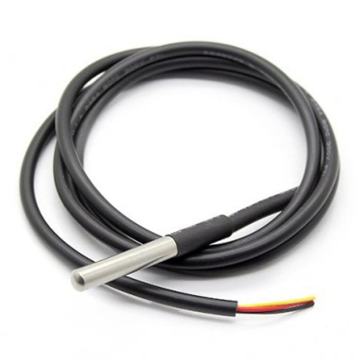 Temperatursensor for Shelly Plus Uni (52247). Kan også kobles med Shelly 1 eller 1PM via tilleggsmodul (ikke inkludert). Kan brukes til maksimums- og minimumsverdier. Måleområde: -55 °C til +125 °C (± 0,5 °C). Oppløsning: 9–12 bits. IP-klasse: IP67. Lengde: 1 meter.