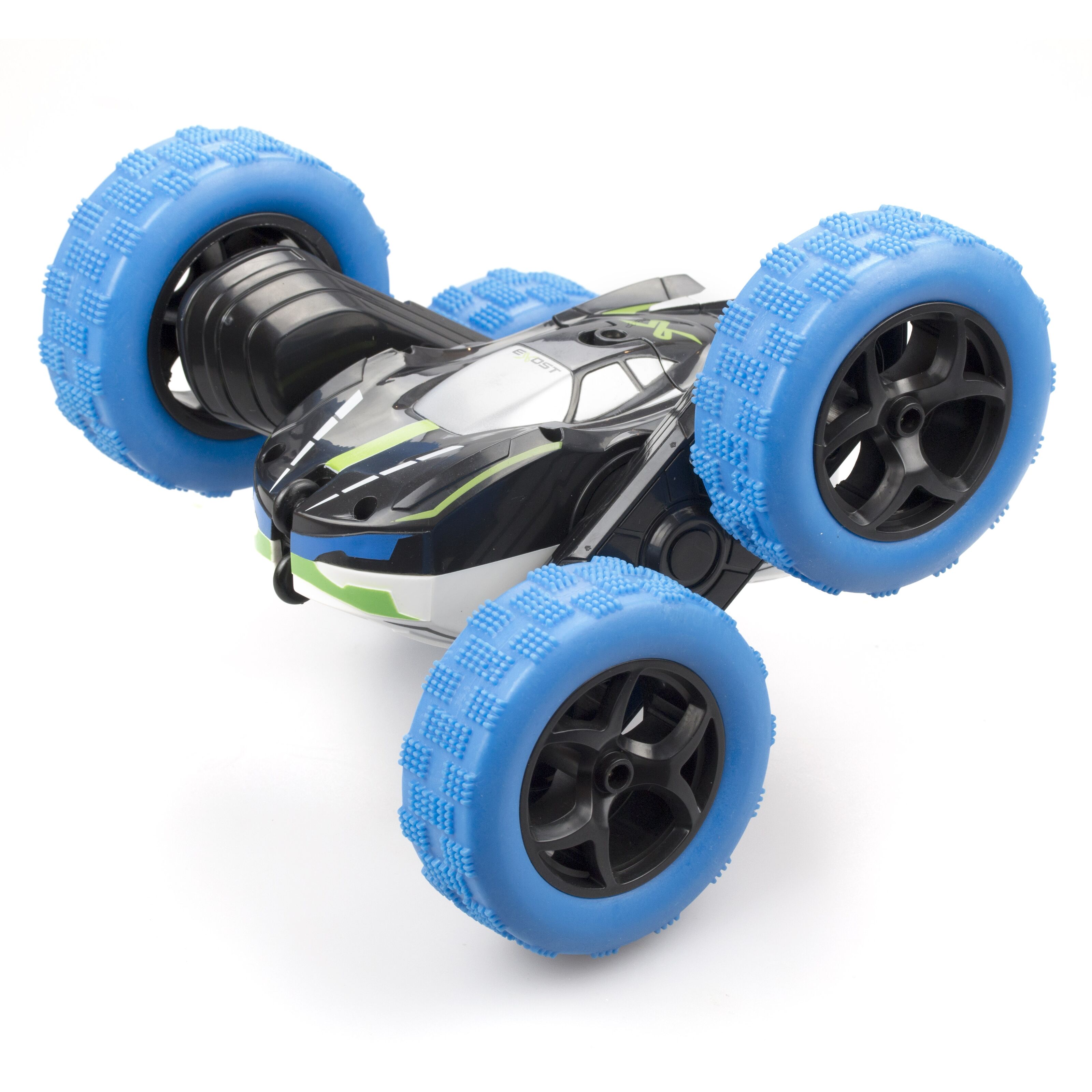 Radiostyrt bil med 360 graders uavhengig svingende hjulaksler. Utfør gærne triks, kjør på begge sider, klatre eller gjør 360 graders saltoer. Drives av 4x AAA-batterier (følger ikke med). Håndkontrolleren krever 2x AA-batterier (ikke inkludert). Rekkevidde: ca. 10 m. Kjøretid: 30 min. Anbefalt alder: +5 år. Finnes med enten grønne eller blå dekk. Enhetens farge kan variere.